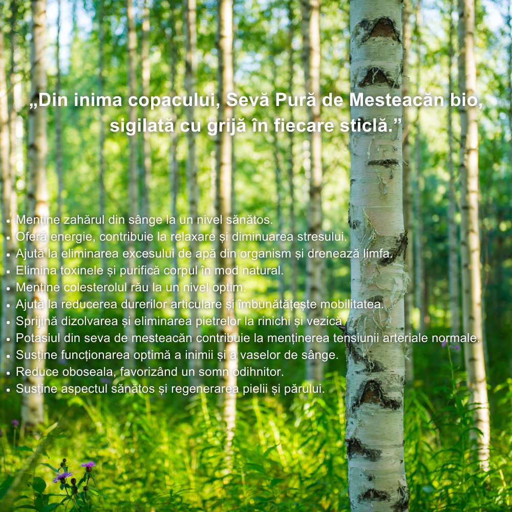 Recoltată doar primăvara, timp de 3-5 săptămâni, seva pură de mesteacăn este bogată în vitamine (A, C, E), minerale (calciu, magneziu, potasiu, zinc) și aminoacizi, oferind un sprijin complet pentru metabolism, detoxifiere și echilibrul hidric al organismului.