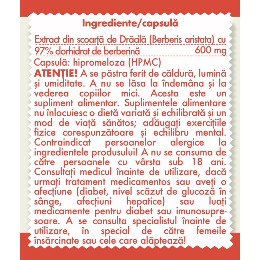 · Berberina Premium 600 mg este un supliment alimentar de înaltă calitate, obținut din extract standardizat de Dracila (Berberis aristata) cu 97% clorhidrat de berberină. Această formă concentrată și naturală este recunoscută pentru efectele sale benefice asupra metabolismului glucidic, funcției hepatice și echilibrului microbiomului intestinal.