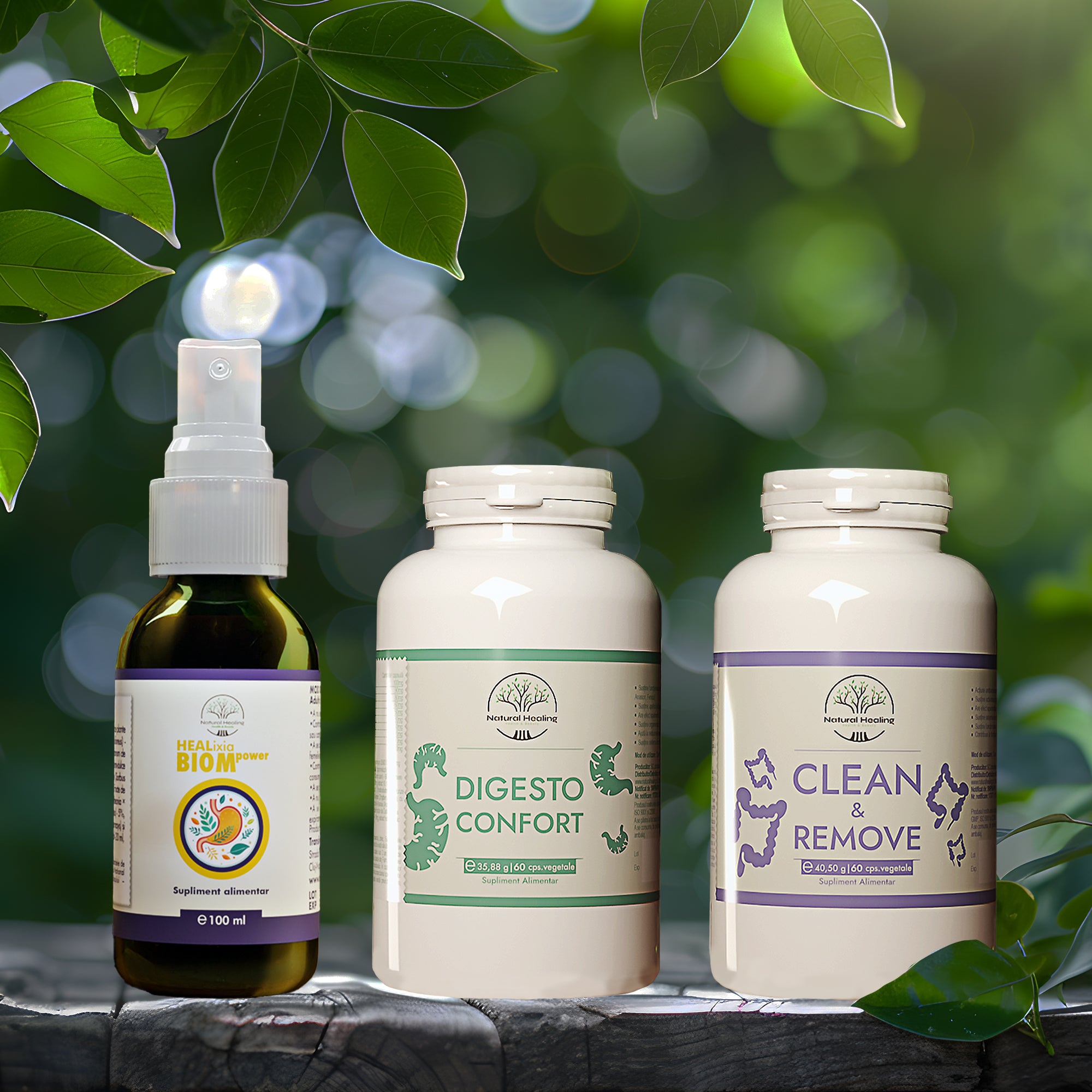 Respectarea dozajului: Pentru a obține beneficii optime, este esențial să respectați dozajul recomandat pentru fiecare supliment din pachet: Clean & Remove – câte 1 capsulă de două ori pe zi. Digesto Confort – câte 1 capsulă de trei ori pe zi. HEALixia BIOM Power – 8–10 pufuri de trei ori pe zi. Citiți cu atenție instrucțiunile de dozare și urmați-le cu strictețe pentru a asigura o administrare corectă și eficientă.