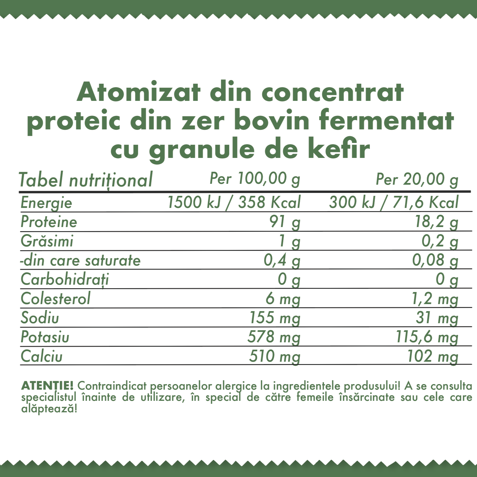 · Calitate superioară (Kefir Whey): obținut din lapte de la vaci hrănite natural pe pășuni, asigurând un produs de calitate ridicată și sustenabil.