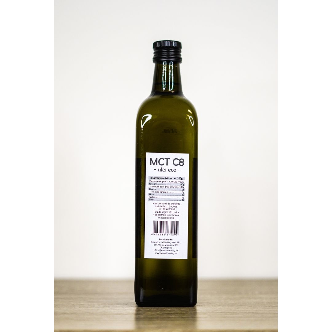 Uleiul de cocos MCT C8 este un ulei pur, obținut prin presare la rece din nucă de cocos organică. Conține 95% acid caprilic (C8:0) care este absorbit rapid și poate fi utilizat eficient în alimentație.